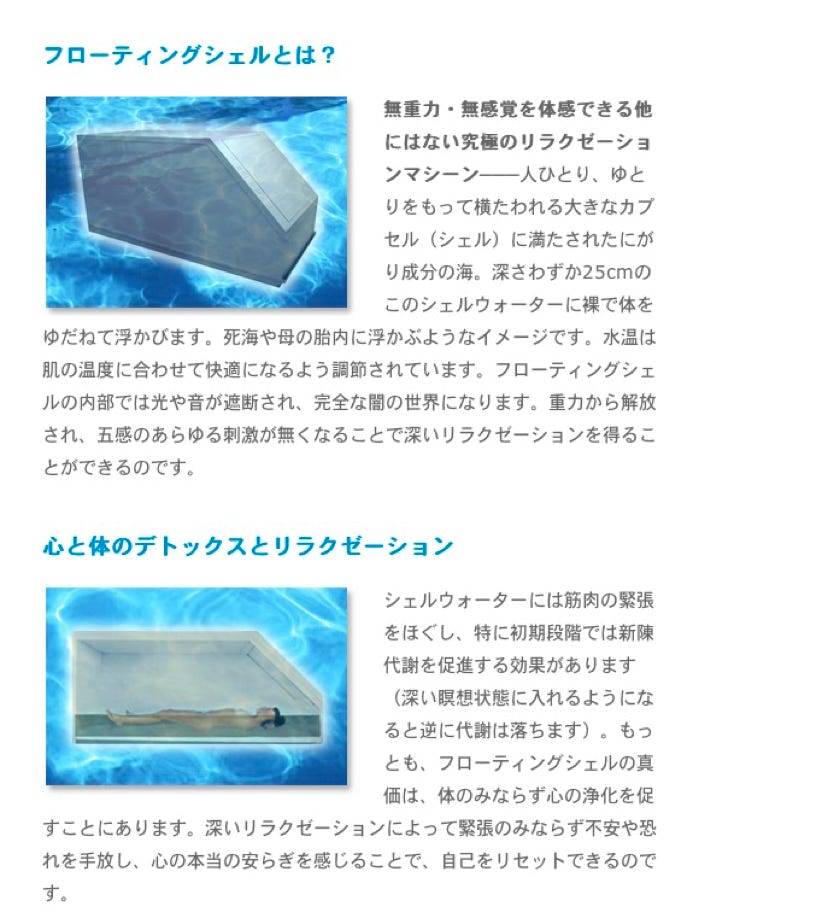 それは人ひとりが横たわるくらいの大きさの密閉カプセル型のプールで、人間が浮かぶ程度の比重を持った液体(濃度の高い硫酸マグネシウム溶液)が入れられています。